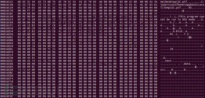 让我想想,如果.pif文件被嵌入在文档中,那么我们该如何提取它呢?又怎样才能找到这个文件的位置呢?这让我想到了名为hexedit和 CFF Explorer的小工具。我在主机上执行了 hexedit ,看看是否可以通过检查十六进制代码找到嵌入的文件。由于.pif文件的执行方式与可执行文件相同,因此我搜索了“MZ”。果然,我能够在一个有意思的文件路径下找到嵌入的文件,可能来自攻击者的主机: