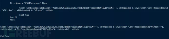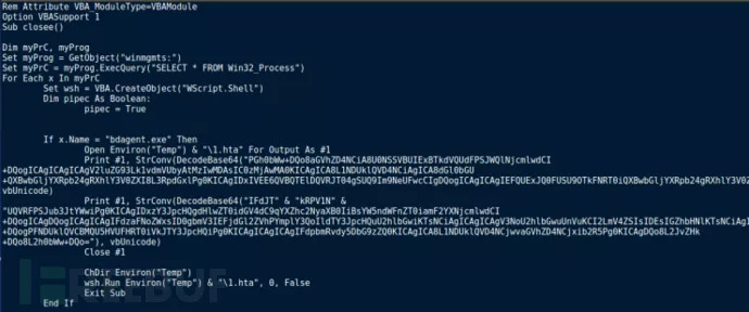 然后,一个for 循环被执行,遍历列表中的每个进程,记为x。对于每个进程,将进程名称与bdagent.exe和PSUAMain.exe进行比较。从名称上看,它们像是由恶意软件下载的恶意文件,以防止出现几个Hancitor实例同时运行的情况。但在我通过Google搜索之后发现,bdagent.exe与BitDefender相关联,而PSUAMain.exe与Panda Security相关联。因此,恶意软件似乎是在检查这两个防病毒程序,并为每个程序运行不同的执行方法。如果bdagent.exe正在运行,恶意宏则将创建%TEMP%\1.hta并将句柄存储在#1中。当你看到Print#1时,宏实际上正在将字符串写入1.hta,而不是将其显示出来。具体来讲,宏会对经编码的字符串进行Base64解码(使用DecodeBase64()),将其转换为unicode字符串,然后写入1.hta。在进行了两次之后,文件会被关闭。最后,使用 一个 WScript.Shell对象将1.hta移动到%TEMP%文件夹并以静默方式执行 ,然后宏退出。