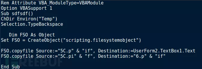 在查看了下一个子程序sdfsdf()之后,我明白了这张图片的作用。我们在下图中可以看到,恶意宏将目录更改为了“TEMP”,并创建了一个 Scripting.FileSystemObject。Scripting.FileSystemObject会将5C.pif的内容复制到UserForm2.TextBox1.Text和6.pif,然后返回。