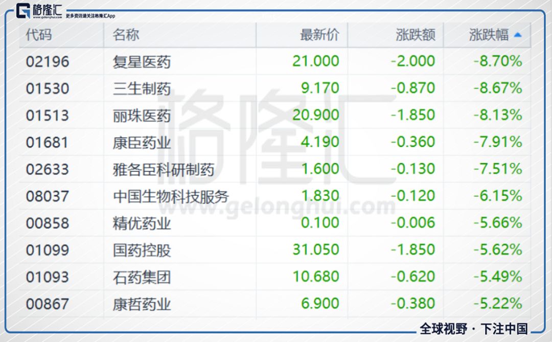 今日,医药板块大幅下挫,复星医药收跌8.7%,报21港元;三生制药收跌8.67%,报9.17港元;丽珠医药收跌8.13%,报20.9港元;康辰药业跌7.91%,报4.19港元。分析指出,系列政策短期对行业的影响具有不确定性,医药行业靠利润大幅增长而股价增长要暂停一段时间,因为创新和仿制药之间的青黄不接。一些机构建议中短期回避化药仿制药。可关注非药领域,如医疗器械、CRO子行业、疫苗产业、医疗服务、药店等。