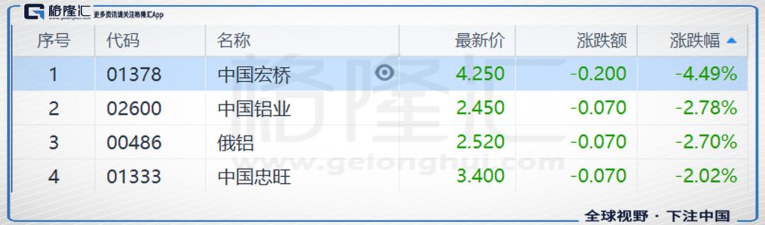 铝板块快速下跌中国宏桥跌3.15%