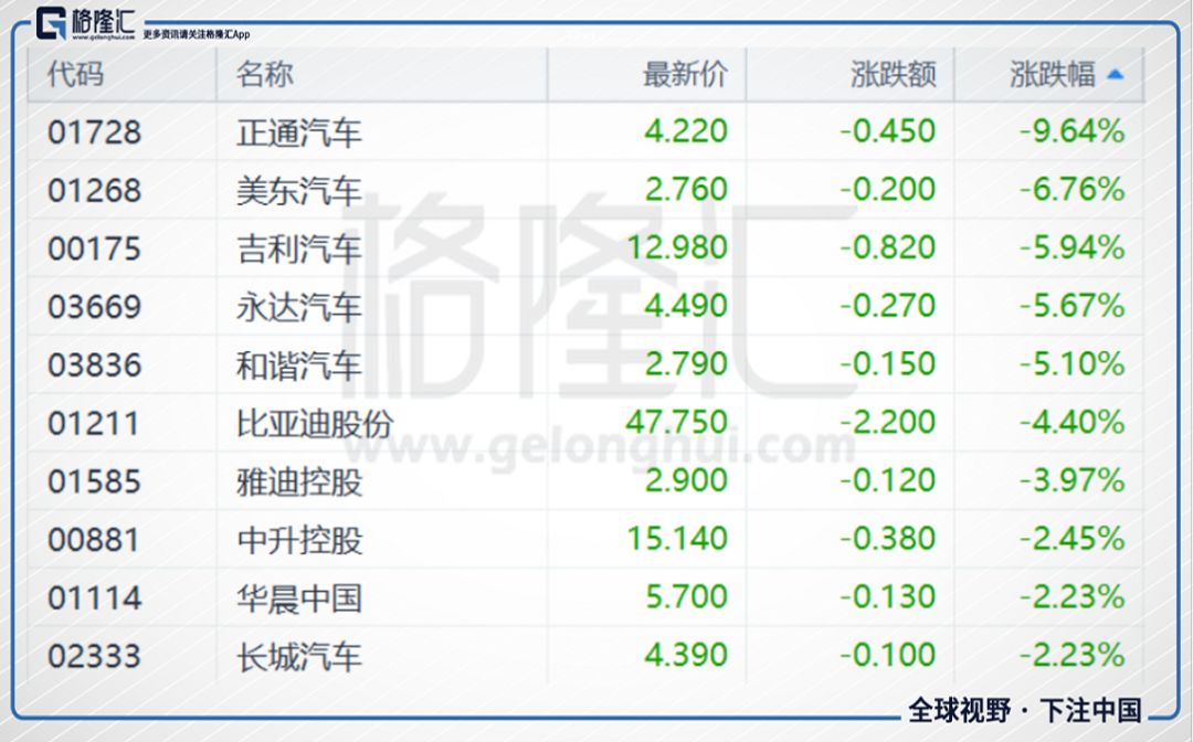 早前市场曾传出,发改委已向中国高层提出建议,将1.6升及以下的乘用车车辆购置税由目前的10%减至5%,当时刺激股价向上。不过,假期前公布的《中华人民共和国车辆购置税法》,明确写入车辆购置税的税率为10%,令汽车购置税减半预期落空。汽车代理股及汽车股普跌。