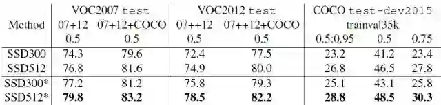 首先整体看一下SSD在VOC2007,VOC2012及COCO数据集上的性能,如表1所示。相比之下,SSD512的性能会更好一些。加*的表示使用了image expansion data augmentation(通过zoom out来创造小的训练样本)技巧来提升SSD在小目标上的检测效果,所以性能会有所提升。