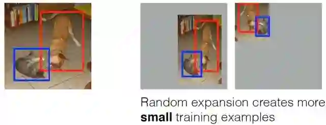 采用数据扩增(Data Augmentation)可以提升SSD的性能,主要采用的技术有水平翻转(horizontal flip),随机裁剪加颜色扭曲(random crop & color distortion),随机采集块域(Randomly sample a patch)(获取小目标训练样本),如下图所示: