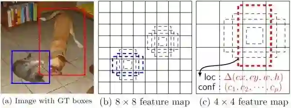 所谓多尺度采用大小不同的特征图,CNN网络一般前面的特征图比较大,后面会逐渐采用stride=2的卷积或者pool来降低特征图大小,这正如图3所示,一个比较大的特征图和一个比较小的特征图,它们都用来做检测。这样做的好处是比较大的特征图来用来检测相对较小的目标,而小的特征图负责检测大目标,如图4所示,8x8的特征图可以划分更多的单元,但是其每个单元的先验框尺度比较小。