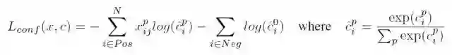 训练样本确定了,然后就是损失函数了。损失函数定义为位置误差(locatization loss, loc)与置信度误差(confidence loss, conf)的加权和: