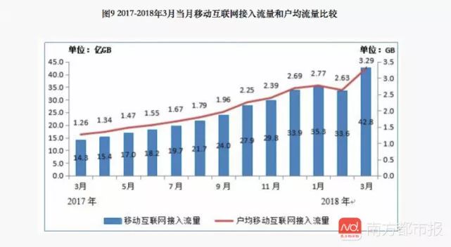 南都记者了解获悉,2018年第一季度,中国手机网民月均使用流量已达到3.29GB,比去年同期增长160%,通过手机上网的累计流量达到109亿GB,同比增长210%。消费者流量使用增速超过了流量资费的下降幅度,这也是用户感知资费下降不明显的主要原因。