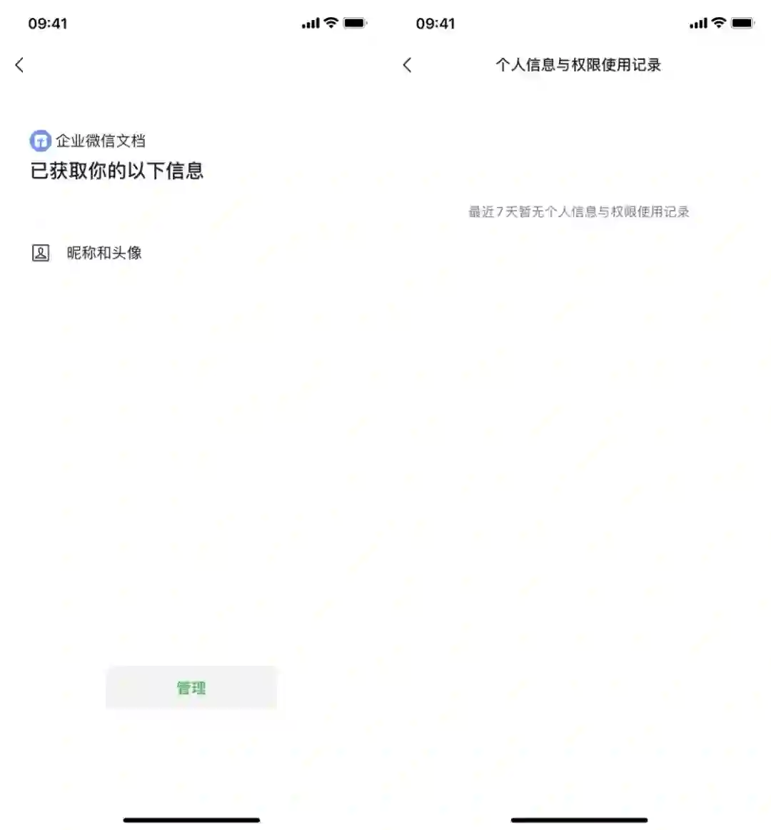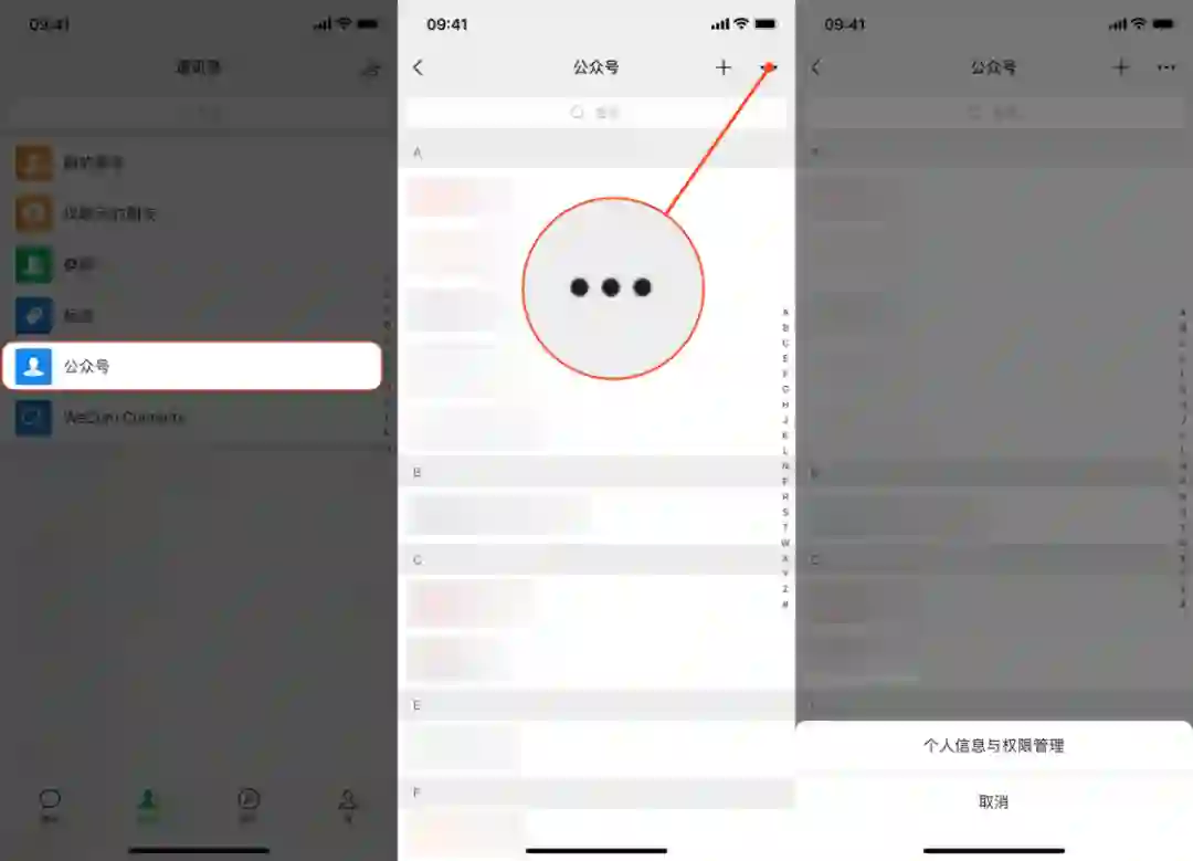 在「通讯录 > 公众号」页面点击右上角的「···」就能找到「个人信息与权限管理」,点击即可查看自己授权过哪些公众号。点击某一个公众号或小程序的名称,即可进入次级菜单,查看当前公众号 / 小程序已获取的信息、以及它最近 7 天的是否有使用记录。
