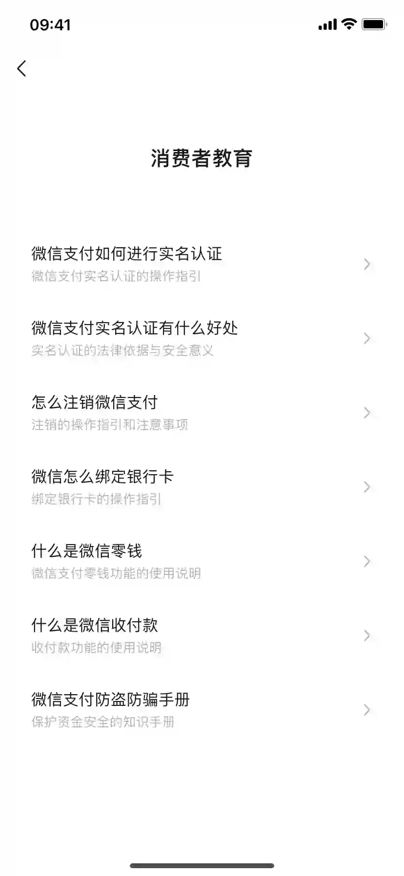 此功能相当于是微信客服和 Q&A 的聚合,当你遇到微信支付相关的问题,可以直接在「帮助中心」联系人工客服,对于一些简单的问题,比如怎样注销微信支付、怎样绑定银行卡,则可以到「消费者教育」里找到答案。