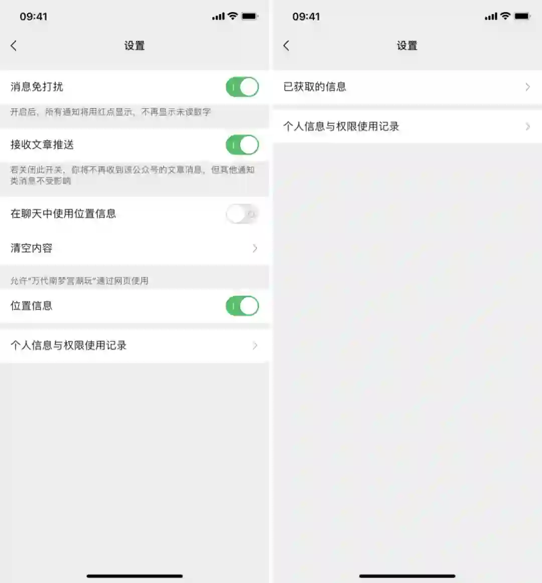 值得一提的是,如果你点击的是小程序,那么只会看到「已获取的信息」和「个人信息与权限使用记录」两个菜单。但如果你选择的是公众号,还能看到消息免打扰、接收文章推送等开关,方便你一步到位地解决权限管理问题。