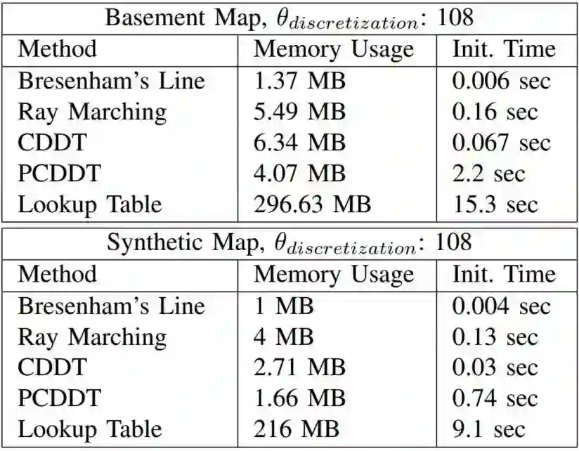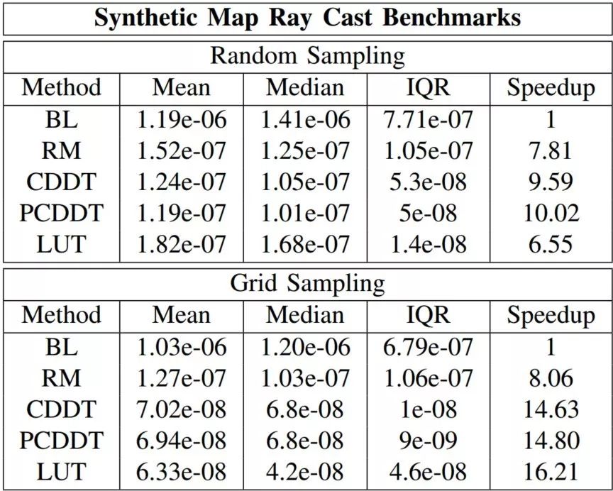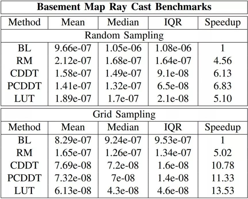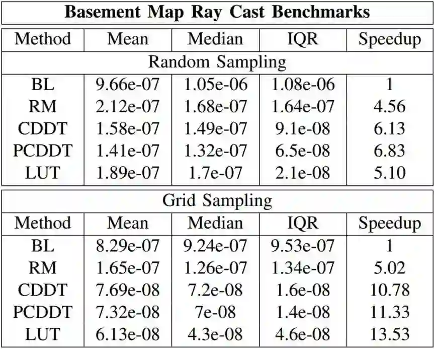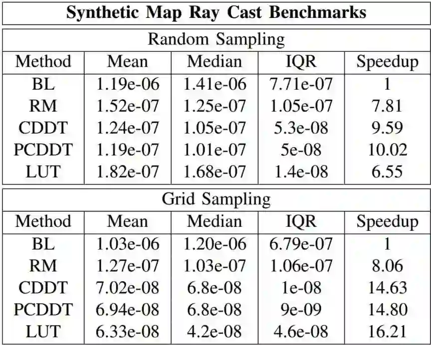 表2 在两个不同地图上的定位速度,Speedup一栏指的是各种方法相对于Bresenham's Line的速度提升对比。