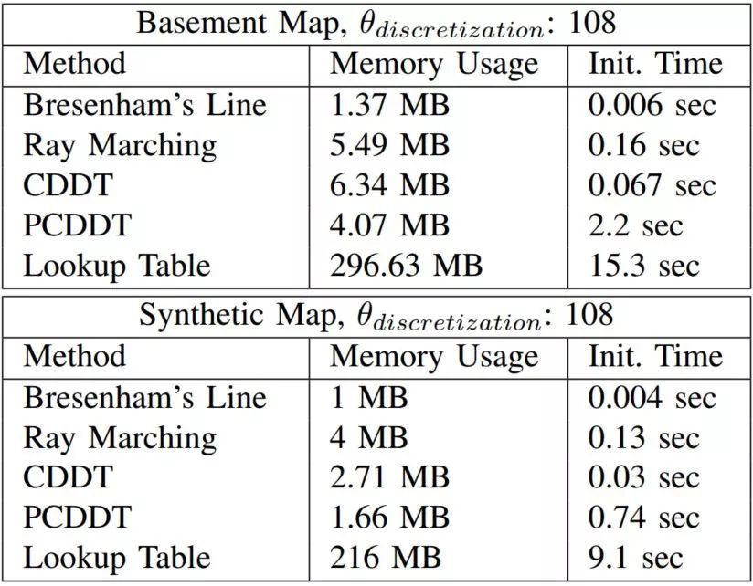 表1 各种方法内存使用量和初始化时间对比(CDDT和PCDDT是本文所提方法)。
