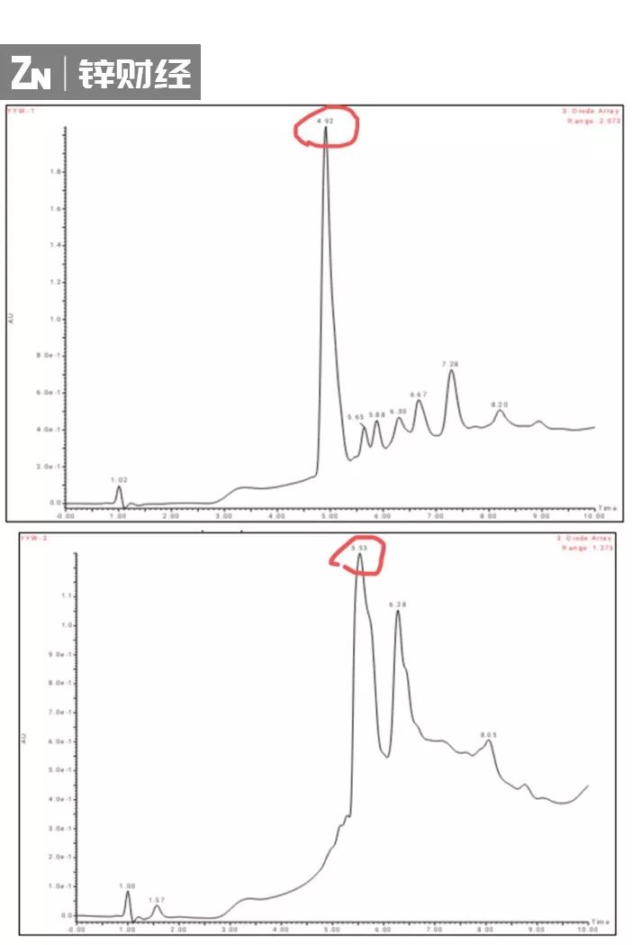 马亮向我们提供了两份完整的样本检测报告,根据两款产品的总离子流图显示,两瓶样本的形状差异较大,且主要成分的流出时间相差0.6分钟即36秒,远超0.1分钟的误差范围。