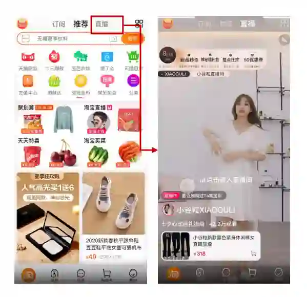 但是淘宝直播则与整套淘系流量分配体系挂钩,用户依照原有商品访问路径进入详情页后再根据提示进入直播间、退出直播间在购物车最终转化成交的现象非常典型。