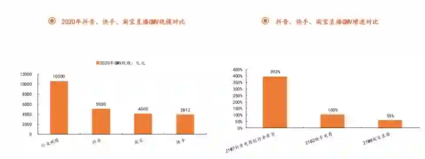 根据研报显示,从2020年全年GMV看,淘宝直播电商GMV达4000亿,抖音直播电商GMV在5000亿左右,快手直播电商GMV达到3812亿。