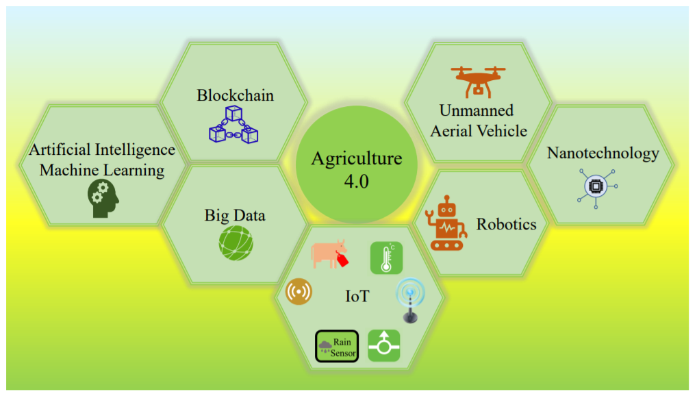 为了缓解这些问题,食品和农业行业欢迎“农业4.0”,这是一场以科技为核心的绿色、智能革命。图1为智慧农业概述。如果我们回顾一下工业革命,我们会发现它实际上开始于新石器时代和铜器时代,当时的人们使用木头和岩石作为工具,后来又使用金属作为农业工具。但是工业1.0是从蒸汽机的使用开始的。大规模生产和使用电能开创了工业2.0。工业3.0伴随着自动化和信息技术的使用,而工业4.0则通过人工智能、大数据(BD)、物联网(IoT)、机器人技术等来连接网络物理系统中的机器和节点。一场平行的农业革命也随之发生——首先是农业1.0的本土工具,农业2.0的拖拉机和化肥的使用,农业3.0的决策和监控系统,以及农业4.0[5]的智慧农业。农业4.0是由多种技术的融合定义的,如物联网、人工智能、区块链、无人机(UAV)的使用、纳米技术和机器人技术,如图2所示
