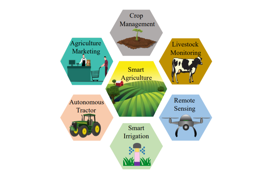 本节将讨论智慧农业的应用领域。图8展示了智慧农业的一些应用领域,如作物管理、智能灌溉、牲畜监测、病虫害防治等。图10展示了智能温室、无人机和自动拖拉机、水耕系统等应用领域。