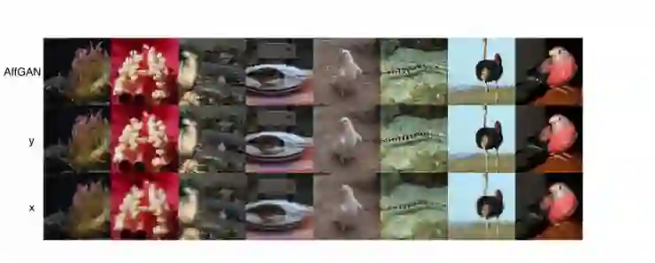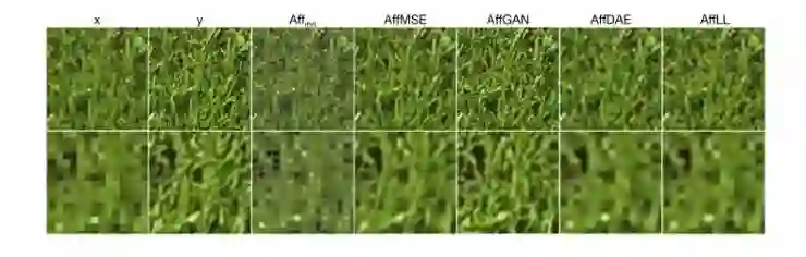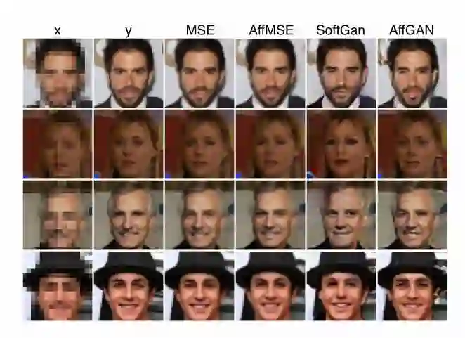 顶行中 x 为输入模型的低分辨率图像, y 为高分辨率原图;剩余顶行各栏为模型根据相应算法输出的图像。 底行为顶行相应图像的局部放大图。从局部放大图可知, AffGAN 得出的图像比 AffMSE 得出的图像效果更锐利更清晰。 请注意,AffDAE 和 AffLL 都只能得出非常模糊的图像。图中第三列是未经仿射投影训练的模型输出的图像,这个模型采用基线法,例图已经是该模型得出最佳上采样效果的图像。