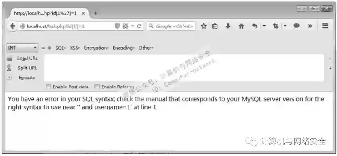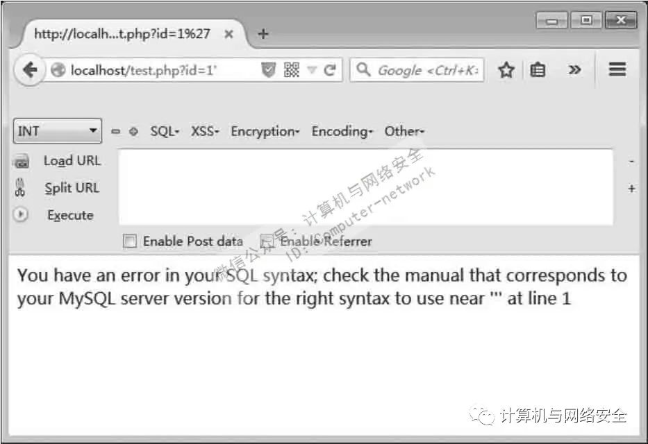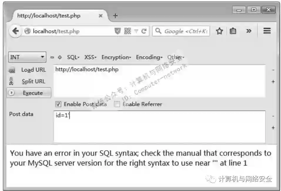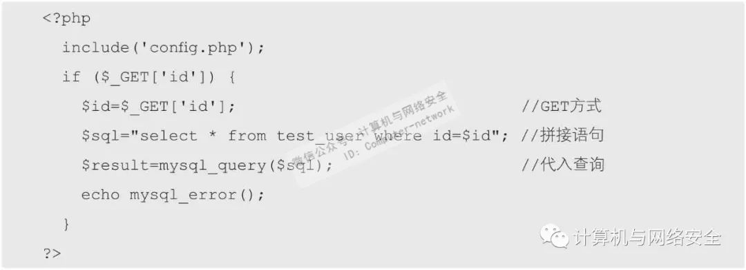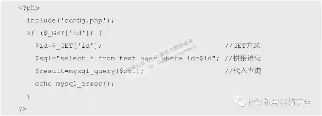 从代码中可以看到,先将参数id的值以GET方式传递给变量id,然后直接将变量id代入了SQL语句进行查询。而当提交如单引号这样的特殊字符时,便会出现语法错误,从而产生报错。