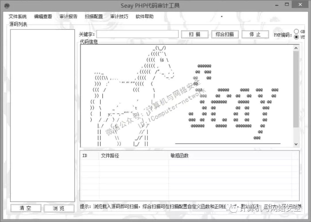 Seay PHP代码审计工具支持单个关键词扫描、批量函数扫描、批量正则匹配。相对纯文本而言,提高了不少效率,如图1所示。
