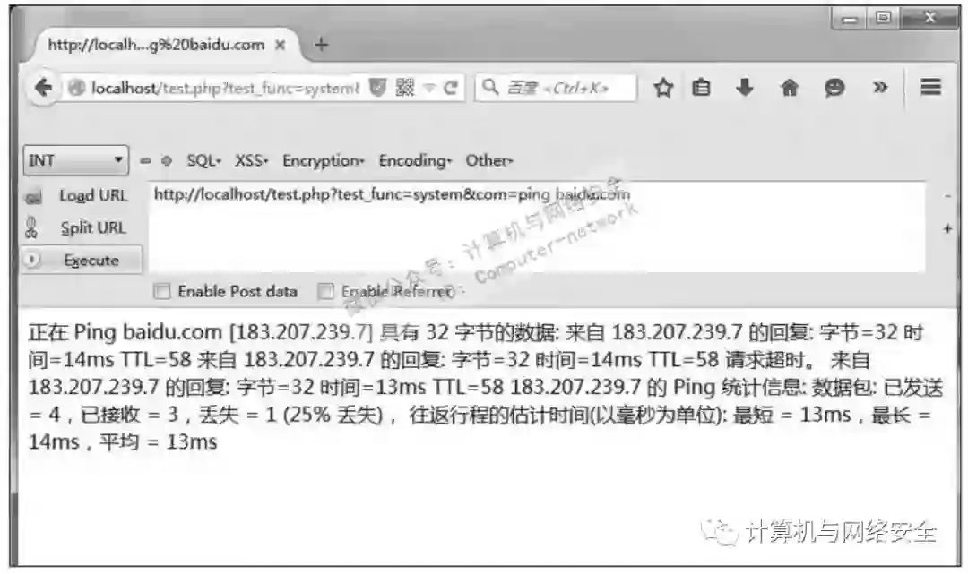 在上述代码中,程序员原意是想动态调用A函数和B函数,所以把变量test_func作为函数名,并且可控。但这其实等同于可以执行任意函数,当直接令参数test_func为system,参数com为ping baidu.com时,结果如图21所示。