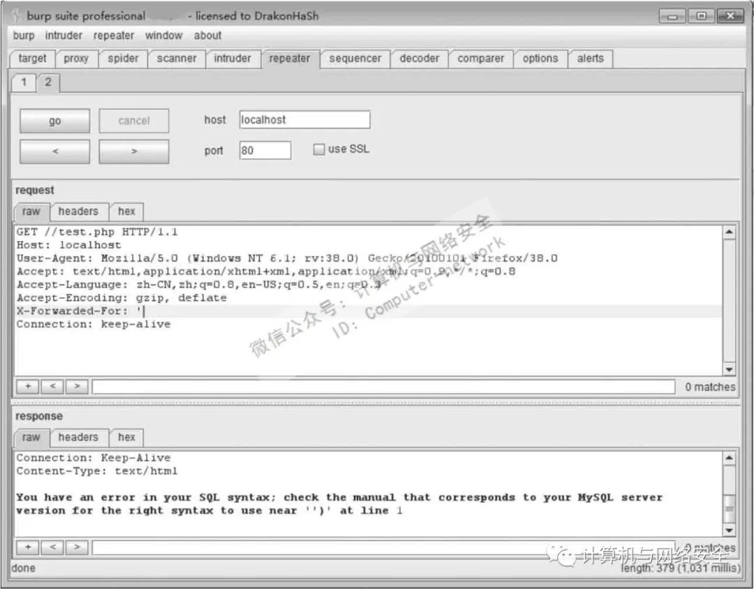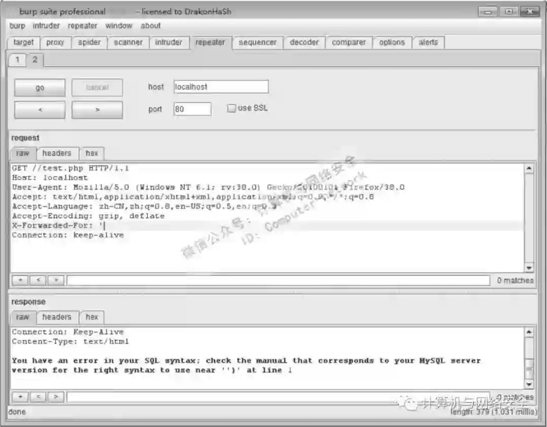 在数据包中加上X_FORWARDED_FOR参数,输入单引号,结果如图12所示。