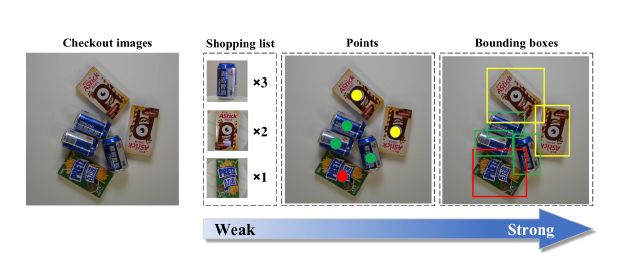另外,研究人员也为每一个结算图像分别添加了三种不同强度的监督标签,从弱到强,最强的是边界框,其次是点,最弱的是仅仅给出图中出现的购物单。