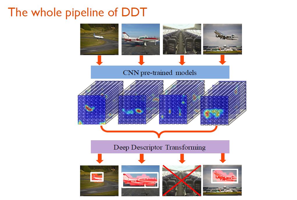 在协同定位的场景下,人们期望借助整个图像集合中所有图像之间关系的信息,由此做好物体的定位。研究人员提出了一个DDT(Deep Descriptor Transforming)方法。与SCDA方法类似,在DDT方法中,属于同样语义的图像一开始会被送入一个预训练的CNN分类网络,得到对应的一些tensors。