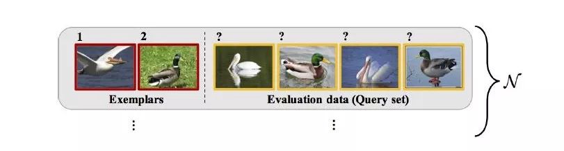 所谓少量样本细粒度识别,即通过让系统在少量样本上学习,从而在测试数据上达到较好的细粒度识别效果。以下图为例,整个灰色区域被称为一个“episode”,类似于传统深度学习的一个batch。系统通过在名为“1”、“2”两只鸟的训练数据上进行训练,进而对后面的evaluation data展开识别。
