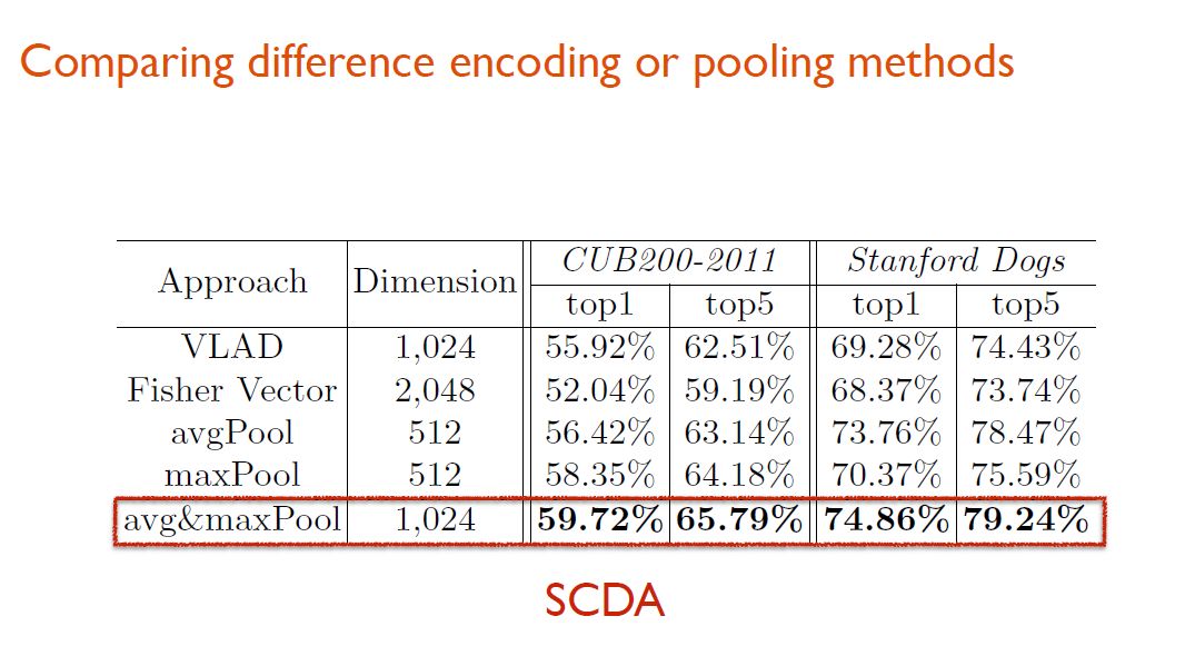 通过将这三种方法在两个benchmark数据集(CUB200-2011、Stanford Dogs)上进行对比实验,研究人员发现,将avgPool和maxPool进行级联可以获得最佳性能。这种经过级联筛选以后得到的特征被称为SCDA。