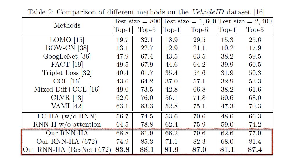 研究人员将该模型在两个权威的数据集VeRi(50, 000 张图,776种车辆)、VehichleID(221, 763张图,26267辆车)上进行了实验。结果显示,在这两个数据集上RNN-HA都超越了当前最优的方法。