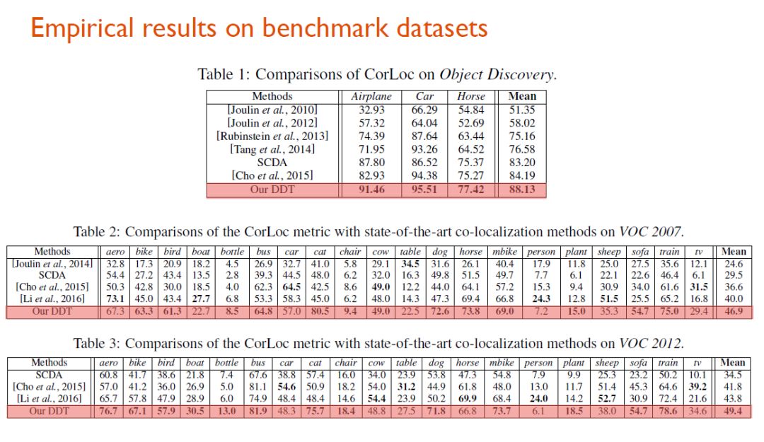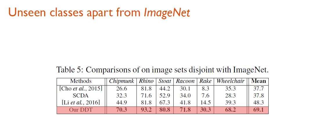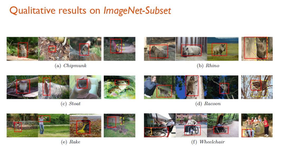 对于ImageNet而言,比较特殊,因为DDT模型使用了基于ImageNet预训练的CNN模型,所以为了观察模型的泛化能力,就必须选择不包含在ImageNet那1000类中的物体类作为测试集。于是研究人员选择了6个不属于ImageNet的类来测试DDT的协同定位效果。结果显示,在面对这些未见过的类别时,DDT算法显著好于其它所有算法。