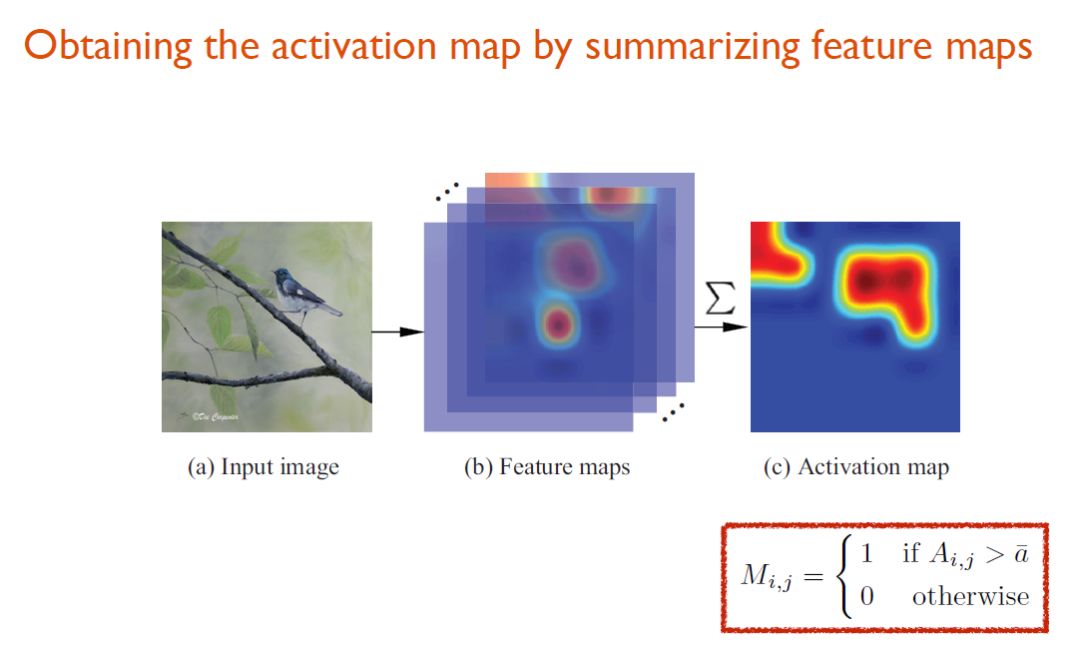 因此从上面的观察能看到,使用全部channel或许会引入噪声,而仅使用某个channel来定位主要物体也是不理想的。于是,研究人员决定把得到的所有特征图从深度方向进行加和,从而得到一个2D的激活图。需要说明的是,这里进行的加和操作依据了如下假设,即如果主要物体出现在了图中,那绝大多数channel都应该在主要物体出现的位置产生激活。因此,如果加和的部分大于其均值,那么系统便会判定这里可能是目标物体出现的空间。