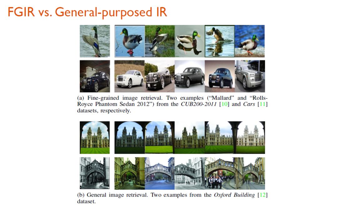 如果将这些系统用于更精细的场景,那么上述方法便显得力不从心了,如给定一只鸟的照片,让系统在两百多只各类鸟中找出同类的鸟。下图展示了细粒度图像检索与传统图像检索之间的差别。