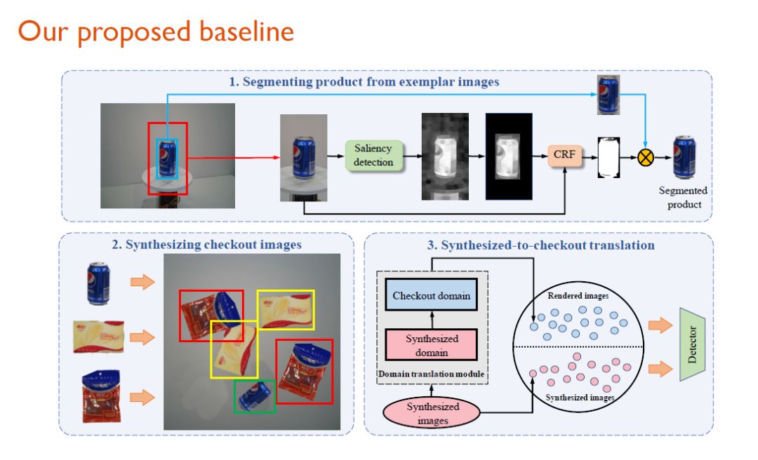 基于“单品图作训练、结算图作测试”的思想,研究人员提出了一个baseline方法。具体而言分为三步,先通过Saliency detection和CRF将商品从原始数据中抠出来。