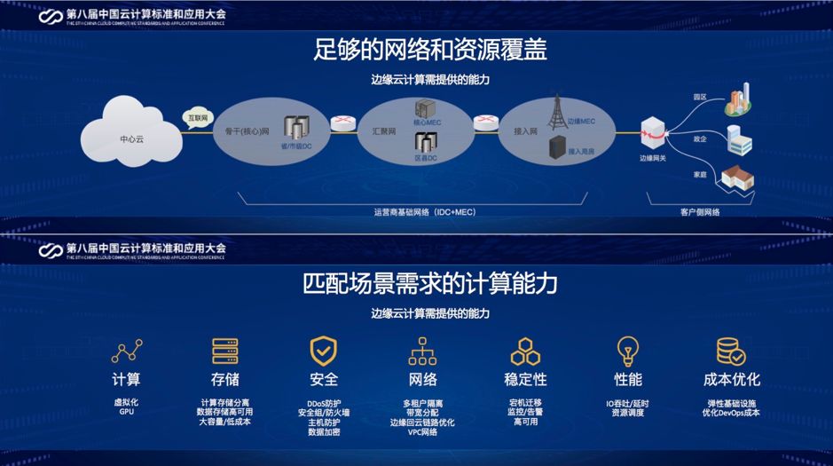 边缘云计算提供的基础能力,主要包括网络和资源覆盖,以及匹配场景需求的计算、存储、安全、网络、稳定性、性能、成本优化等能力。其中很多方案是基于中心云的虚拟化方案进行改造的,比如计算虚拟化、块存储、VPC网络等,当然方案改造也有非常大的挑战,因为飞天系统的很多方案是基于规模化设计。有些则是新场景下的新方案,比如边缘回云的链路优化,资源调度等。