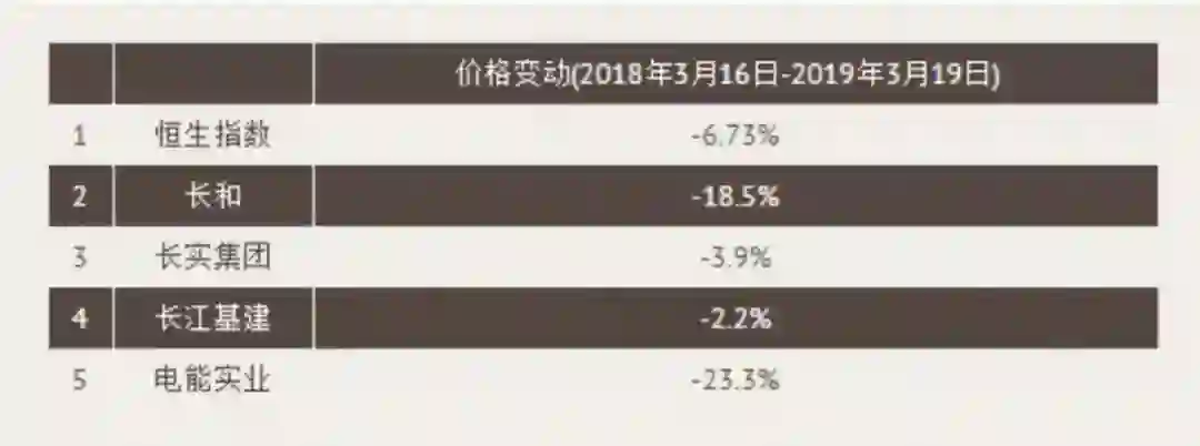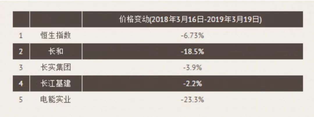 不过"长和系"股票在李嘉诚退休后一年中的表现却不尽如人意,截至3月19日港股收盘,长和下跌18.5%,电能实业下跌23.3%,跑输恒生指数同期6.73%的跌幅,长实集团和长江基建表现相对较好,分别下跌3.9%和2.2%。