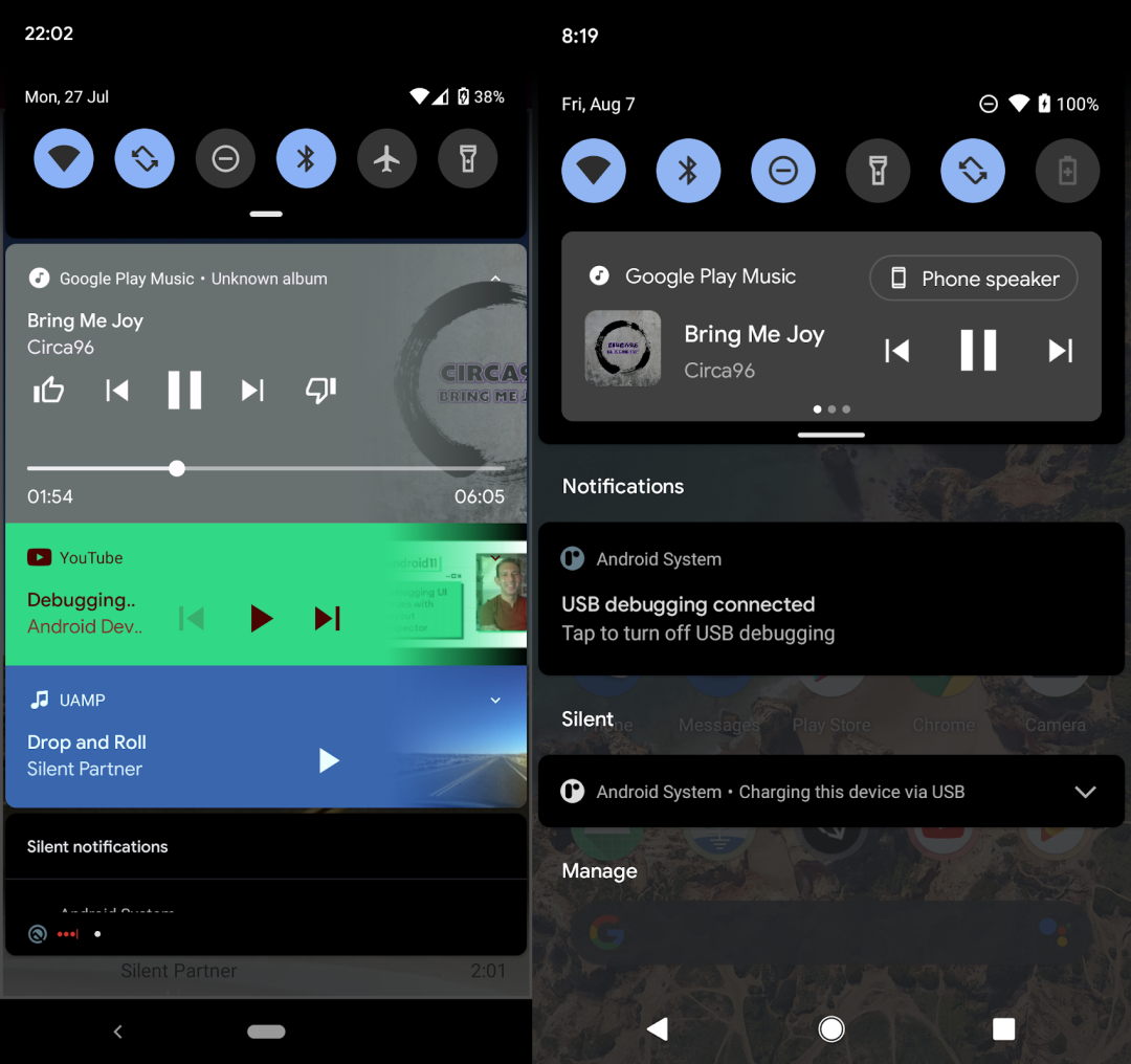 ▲Android 10(左)、Android 11(右)媒体控制对比