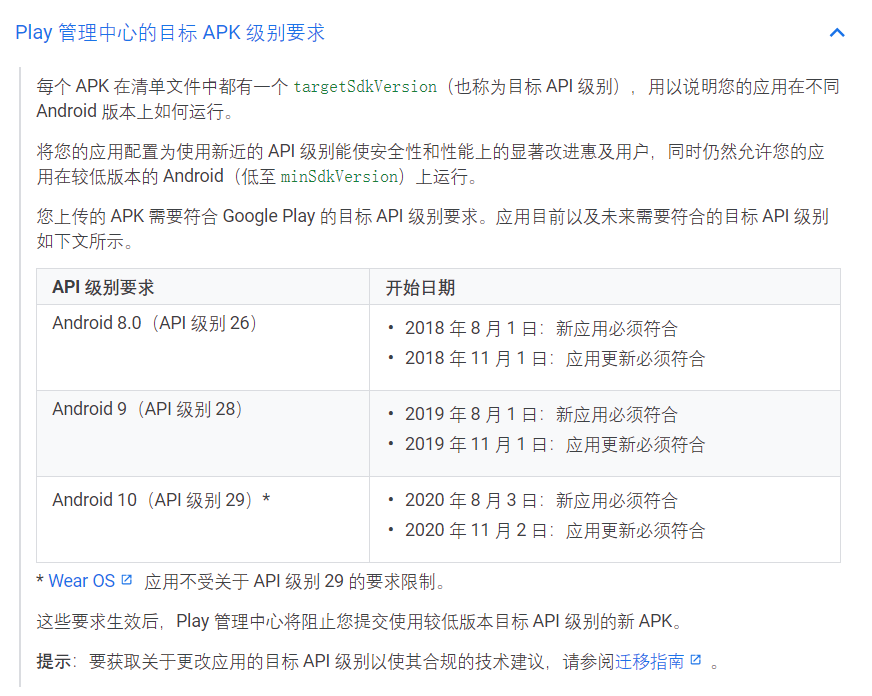 不过考虑到应用适配的问题,谷歌至今都没有强制开启这一模式。但是谷歌也没闲着。根据规则,任何目标API级别为30(Android 11)的应用将必须适配这一机制;而按照现行时间线来看,在2021年提交到谷歌官方应用商店Google Play Store的应用,其目标API级别不能低于30(Android 11)。
