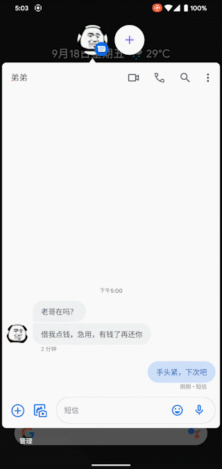 Android 11最引人注目的新功能当数对话泡(Bubbles)。这一功能于Android 10中首先推出,但在Android 11上得到了更广泛的应用。它类似与Facebook Messenger的对话泡类似,可以将一些正在进行中的对话以浮窗的形式显示。