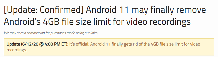 安卓系统视频录制文件大小不得超过 4GB ,这一强力封印可以追溯到2014年。当时智能手机的录像功能还远不如今天这般强大,FAT32格式的存储卡也还大行其道。FAT32格式的存储设备无法存储单个4GB以上的文件。