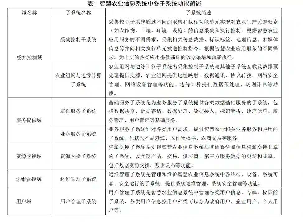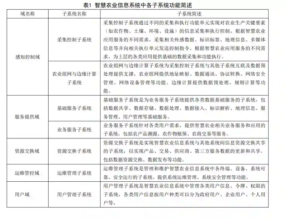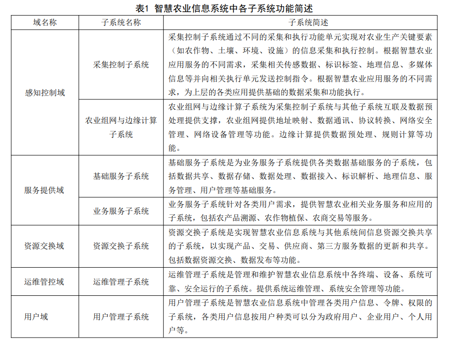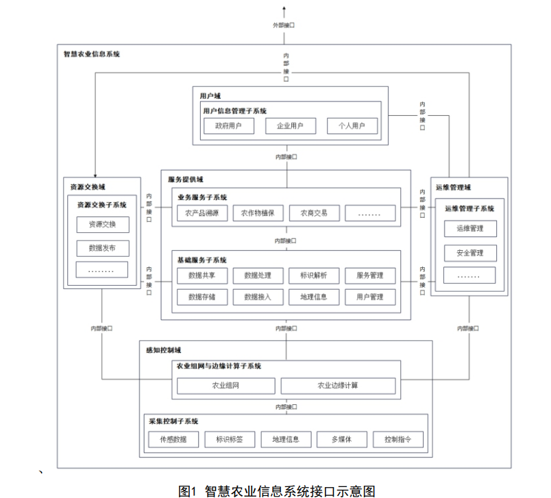 智慧农业信息系统通常由用户域、感知控制域、运维管理域、服务提供域、资源交换域组成,智慧农业信息系统接口如图1所示,智慧农业信息系统有若干个外部接口和内部接口,外部接口用于智慧农业信息系统与其他外部系统进行数据交互,如:用户接入系统、传感网系统、遥感系统等。内部接口用于智慧农业信息系统内各子系统进行数据交互,本文件规定的内部接口的通用要、数据结构、数据交互请求方式、调用流程等要求将在第6章中详细阐述,智慧农业信息系统各子系统功能简述见表1。