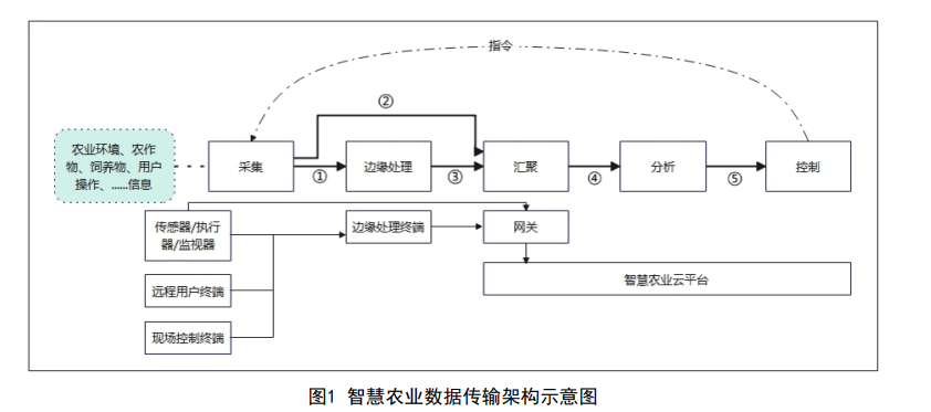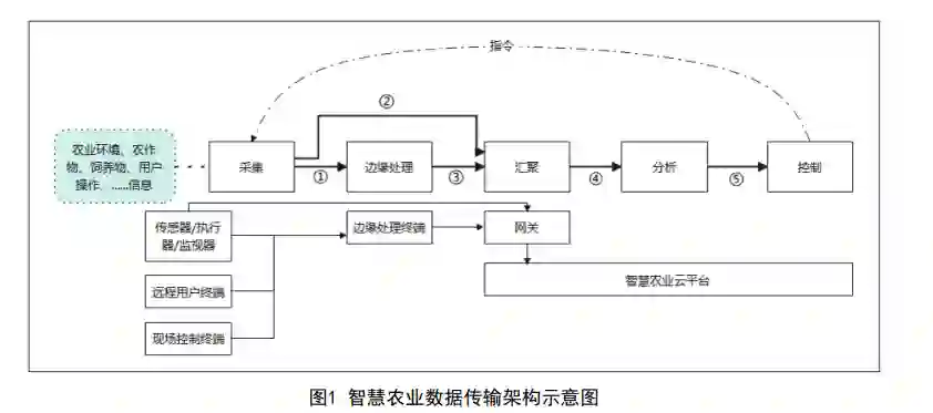 智慧农业数据传输架构示意图如图1所示,通过传感器、执行器、监控设备、远程用户终端、现场控制终端等采集各类数据后,一部分数据传输给边缘处理终端进行边缘数据处理,无需要边缘处理的数据和边缘处理后的数据通过网关传输到智慧农业云平台进行数据的汇聚,再经过智慧农业云平分析后,形成对各数据采集终端的控制决策,以指令的方式传输给传感器、执行器、远程用户终端、现场控制终端等采集终端以执行相关控制操作。各采集终端采集数据的种类如表1所示。数据传输中可能涉及多种传输技术。具体运用何种传输技术取决于项目实现者和可能获得的资源。本文件只针对部分应用场景下传输技术应用给出一些指南。第6章针分别针对大田种植、设施农业、畜禽养殖、水产养殖四个农业场景给出传输技术应用指南。