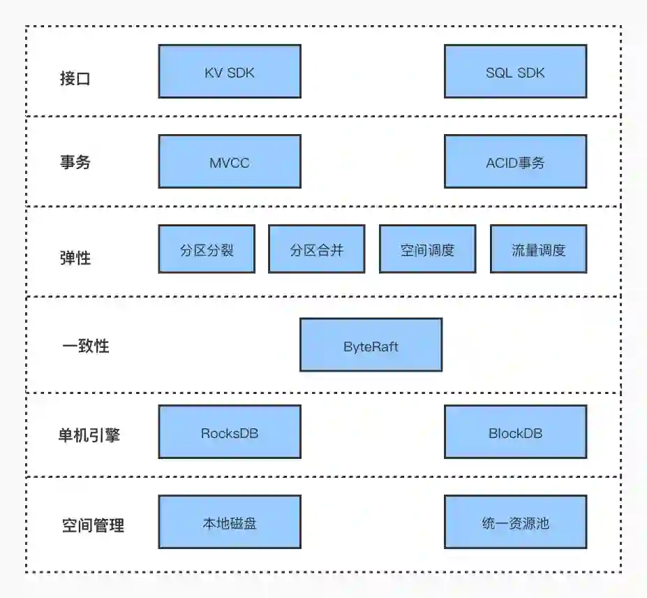 一致性协议层通过自研的 ByteRaft 组件,保证数据的强一致性,并且提供多种部署方案,适应不同的资源分布情况。