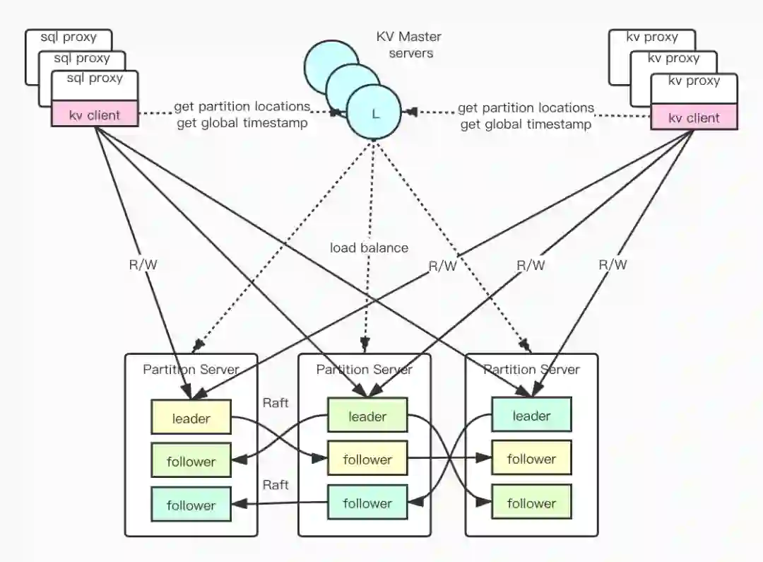 集群中数据会按照 range 切分为很多 Partition,每个 Partition 有多个副本,副本之间通过 Raft 来保证一致性。这些副本分布在所有的 PartitionServer 中,每个 PartitionServer 会存储多个 Partition 的副本,KVMaster 负责把所有副本均匀的放置在各个 PartitionServer 中。各个 PartitionServer 会定期汇报自身存储的副本的信息给 KVMaster,从而 KVMaster 有全局的副本位置信息。Proxy 接到 SDK 请求后,会访问 KVMaster 拿到副本位置信息,然后将请求路由到具体的 PartitionServer,同时 Proxy 会缓存一部分副本位置信息以便于后续快速访问。由于副本会在 PartitionServer 之间调度,故 Proxy 缓存的信息可能是过期的,这时当 PartitionServer 给 Proxy 回应副本位置已经变更后,Proxy 会重新向 KVMaster 请求副本位置信息。