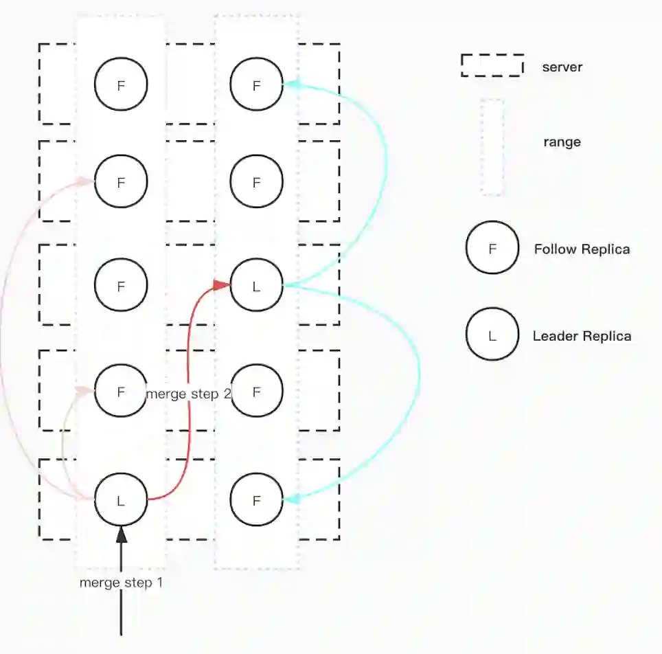 合并的过程比分裂复杂,master 将待合并的两个相邻区间调度到一块,然后发起一次合并操作。如上图所示,这个过程分为两步:首先左区间发起一次操作,拿到一个同步点,然后在右区间发起合并操作;右区间会进行等待,只要当前 Server 中左区间同步点前的数据都同步完成,就能够安全地修改左右区间的元信息,完成合并操作。