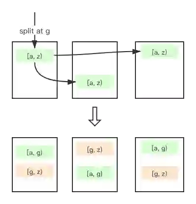 前面提到 ByteKV 采用 Range 分区的方式提供扩展性,这种分区方式带来的一个问题是:随着业务发展,原有的分区结构不再适用于新的业务模式。比如业务写入热点变化,热点从一个分区漂移到另一个分区。为了解决这个问题,ByteKV 实现了自动分裂的功能:通过对用户写入进行采样,当数据量超过一定阈值后,从中间将 Range 切分为两个新的 Range。分裂功能配合上调度,提供了自动扩展的能力。