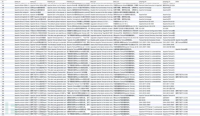 汉化后的数据库可从这个表中获取,https://github.com/TideSec/WDScanner,在数据库文件的 vul_cn 表中。
