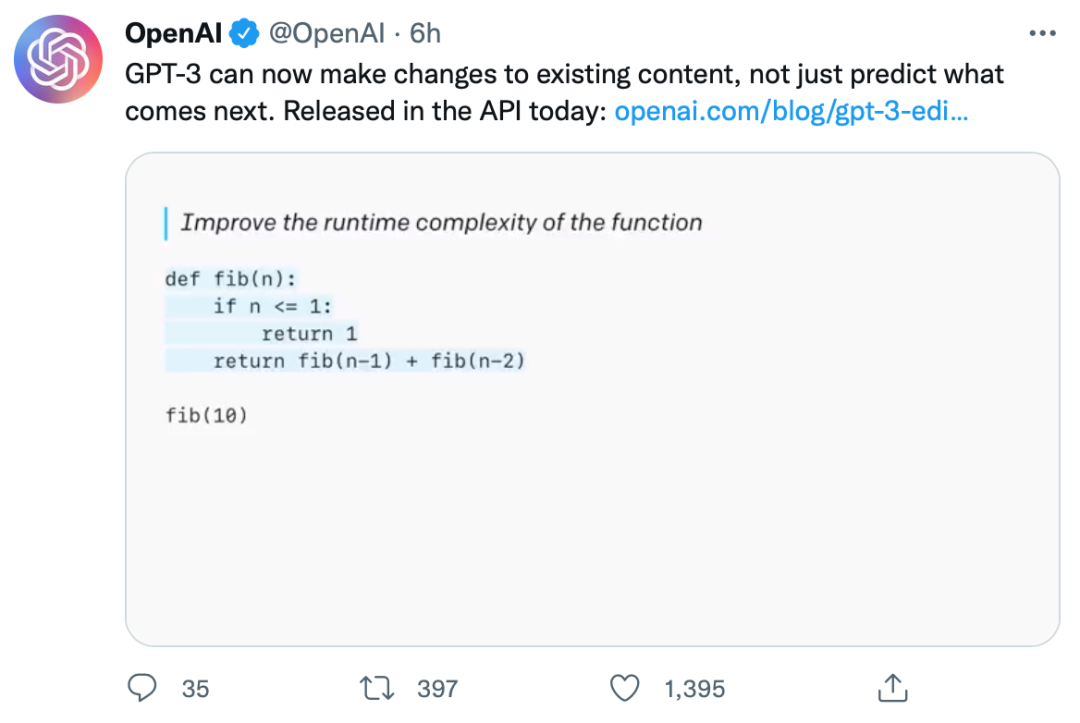 需要注意的是,此处的「编辑」更多是「修改」现有文本,而不是像旧的 GPT-3 一样,沿着已有文本完成后面的写作。